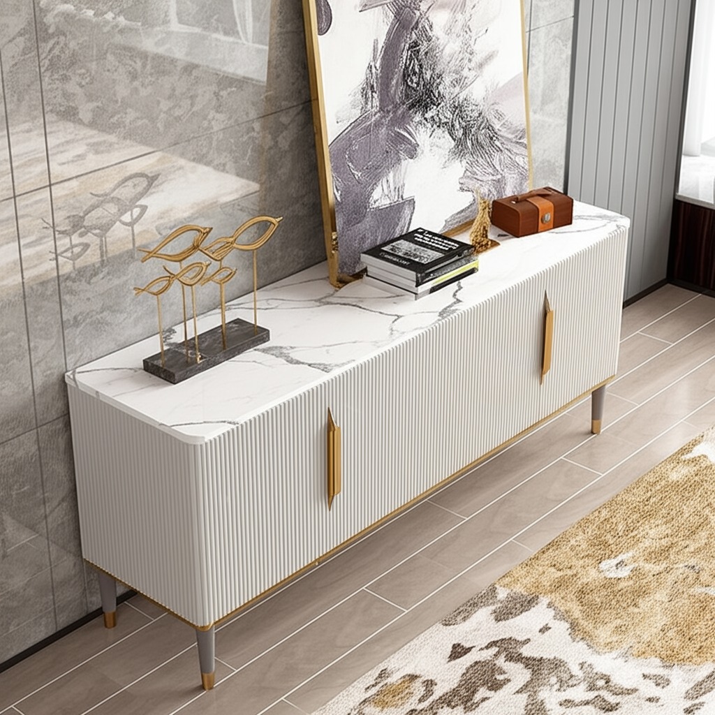 • PREMIUM DESIGN: Luxurious marble top console with gold accents, featuring charcoal louvers and elegant PVD-coated legs for a modern aesthetic