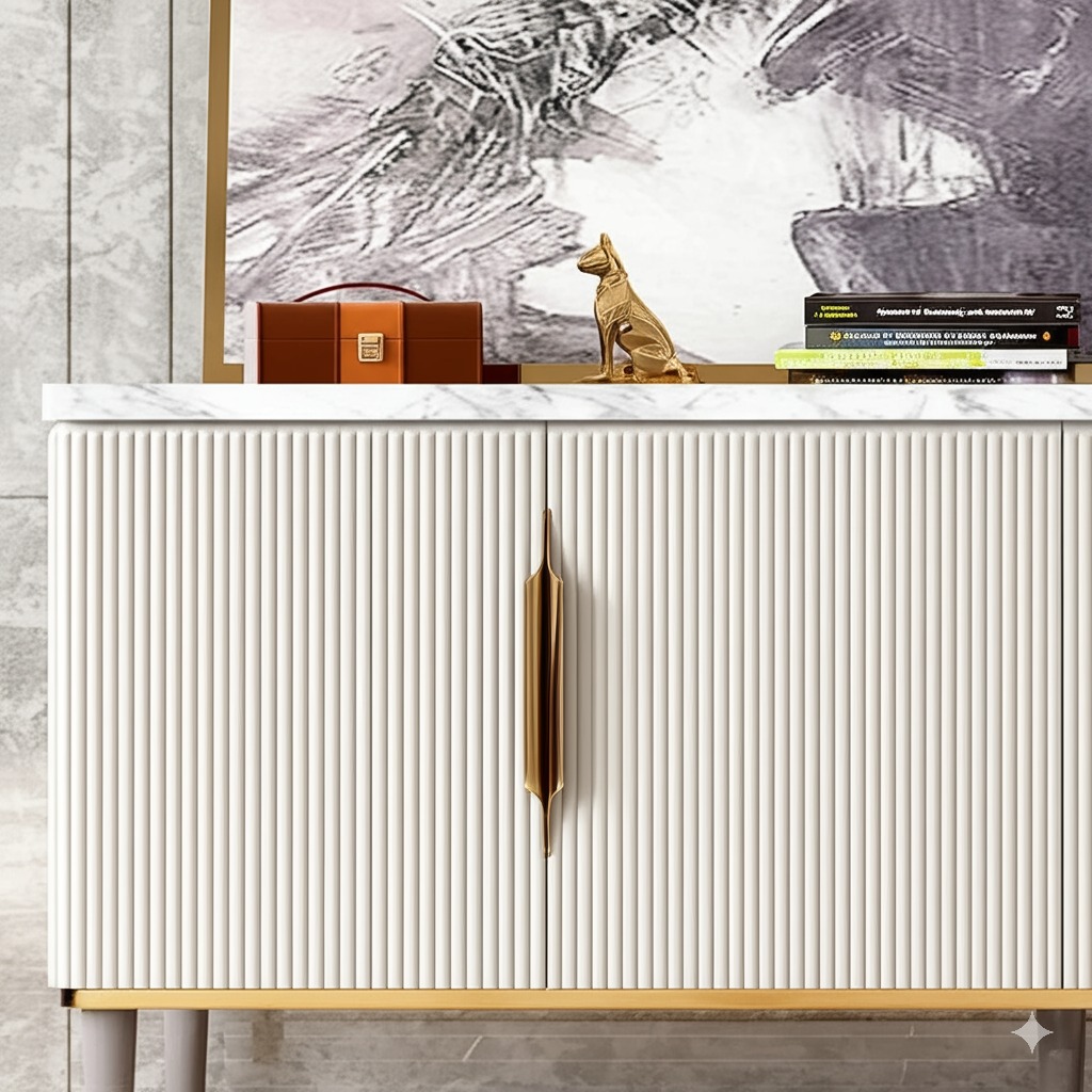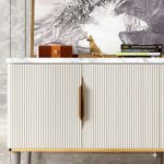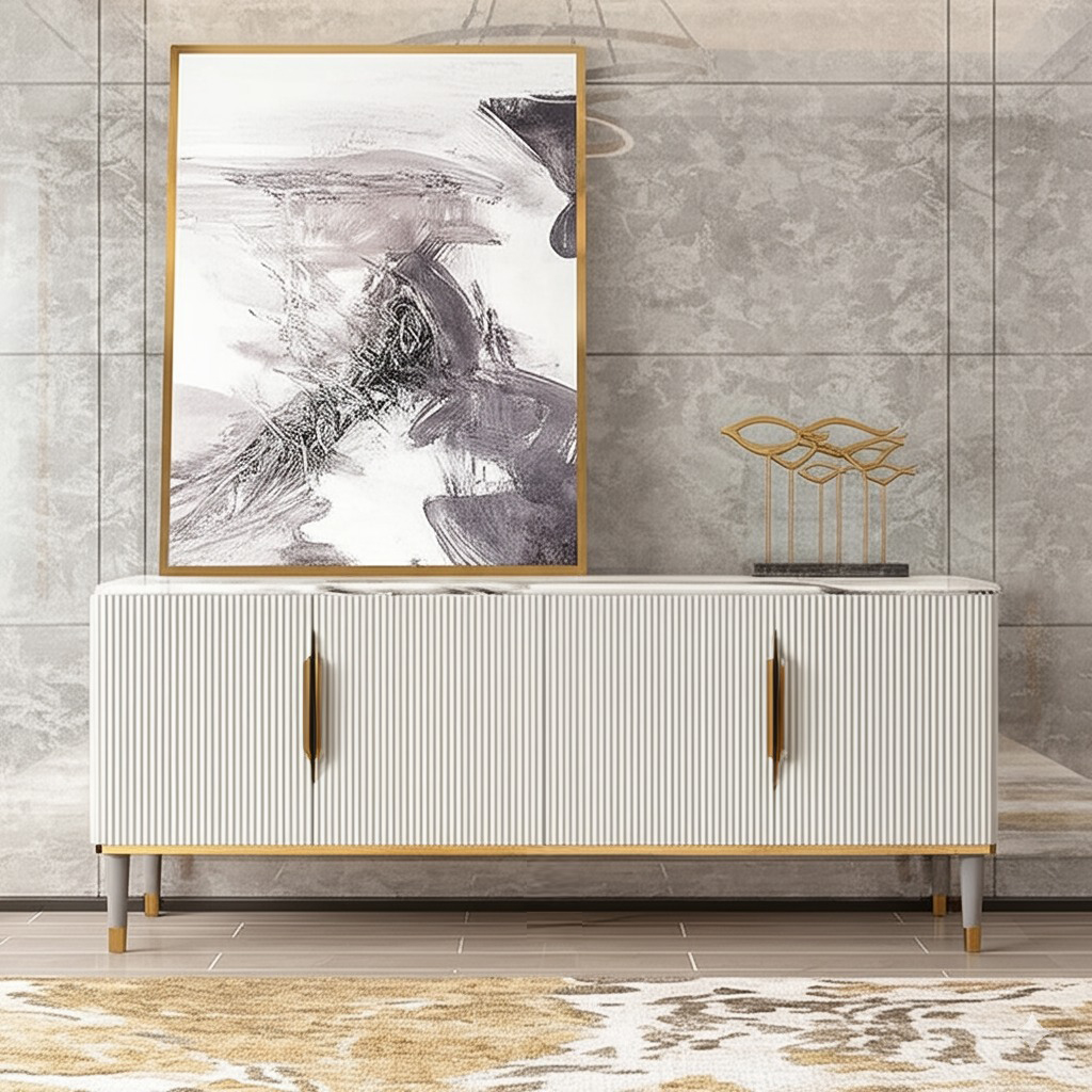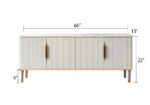 PAAM WOOD Modern Console Table, 55 x 15 x 30 inch, White Ribbed Design, Marble Top, Gold Accents, 4-Door Storage Cabinet, Waterproof Plywood, PVD-Coated Legs, Elegant Entryway or Living Room Console
