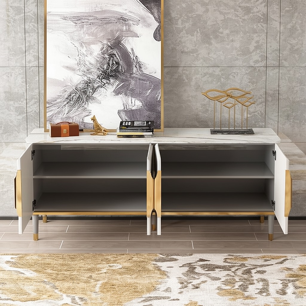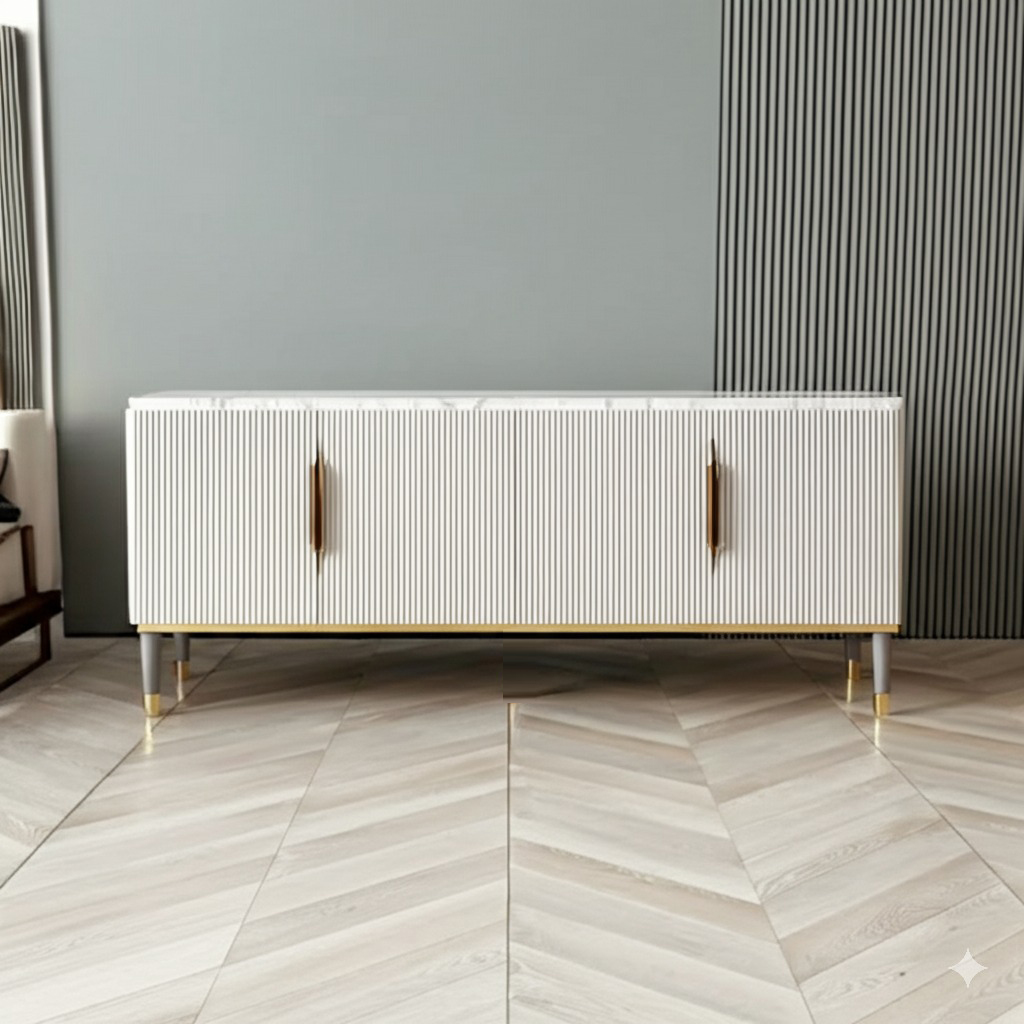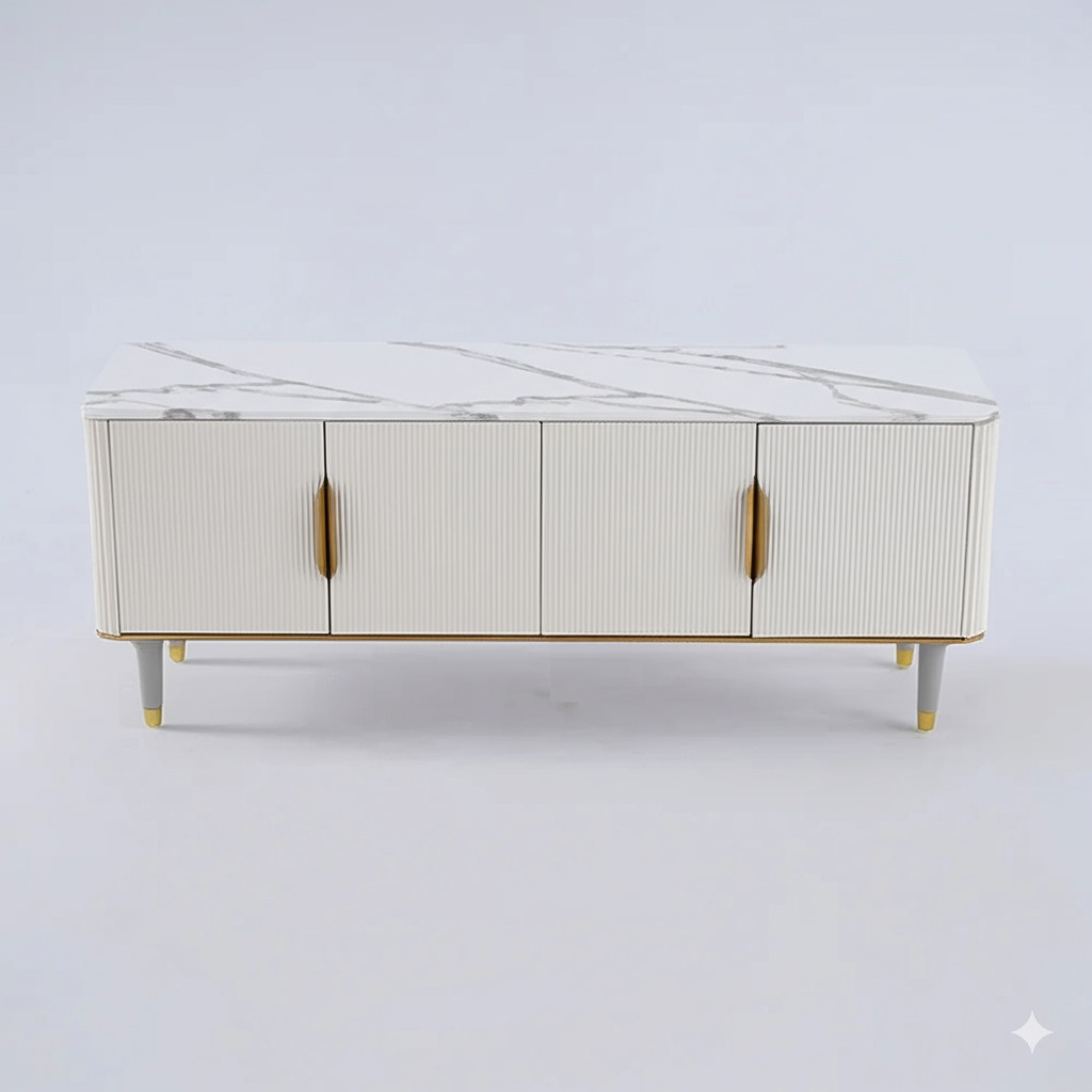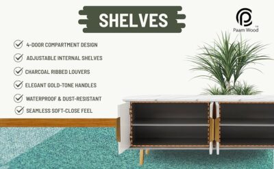 PAAM WOOD Mazzo White Marble TV Unit Console | 70"x15"x18" | Golden Legs & Charcoal Louvers | Storage Drawers | Modern TV Stand Console Unit White Marble Top with Gold Accents, Storage Drawers ₹79,000.00 Original price was: ₹79,000.00.₹39,800.00Current price is: ₹39,800.00.