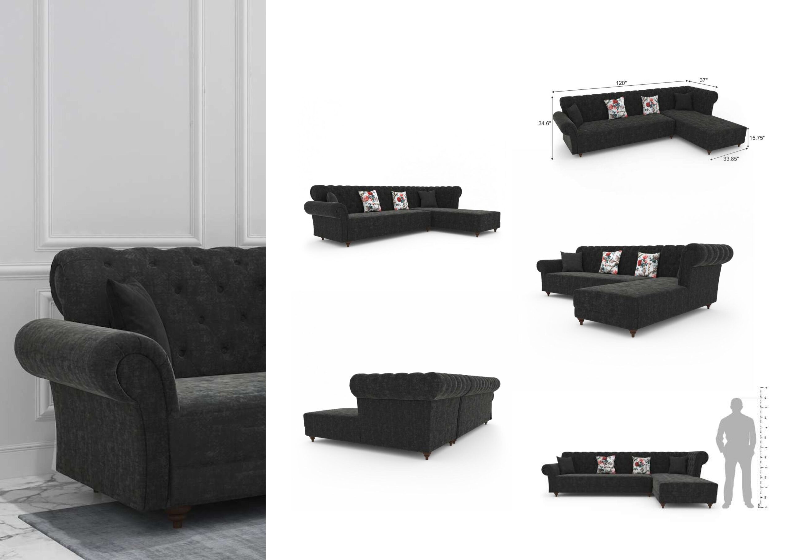 7 Seater Sofa For Home Furniture Upholstery Velvet Luxury Comfort Sofa Durable Design For Living Room -Black