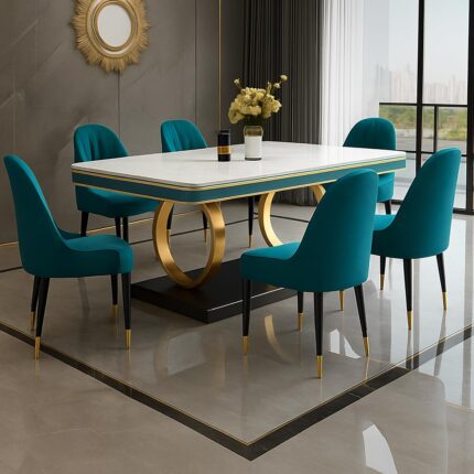 Home Dining Table PAAM WOOD 6-Seater Modern Marble Top Dining Table Set | Premium Neno Top, MS Foldable Base, Sheesham Wood Legs | Suede Upholstered Chairs | Luxury Dining Furniture for Home (Blue) – 36″X72″X30″ in