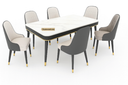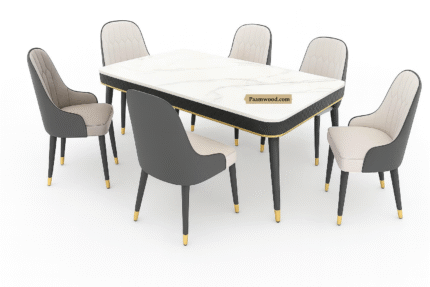PAAM WOOD 6-Seater Dining Table with Marble Top and White Charcoal Louvers base | Includes 6 Fabric Upholstered Chairs (GRAY)