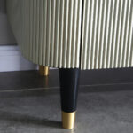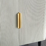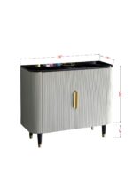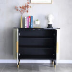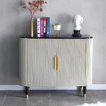 • LUXURIOUS DESIGN: Elegant black marble top with charcoal-coloured vertical louvers, complemented by sophisticated golden accents and handles