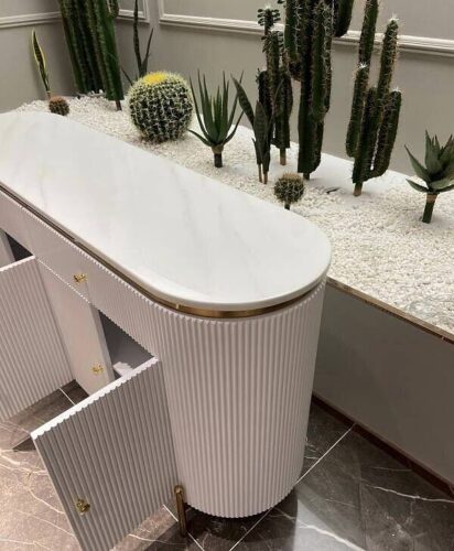 | Style & Finish | Modern white ribbed body, marble-look top, gold accents |